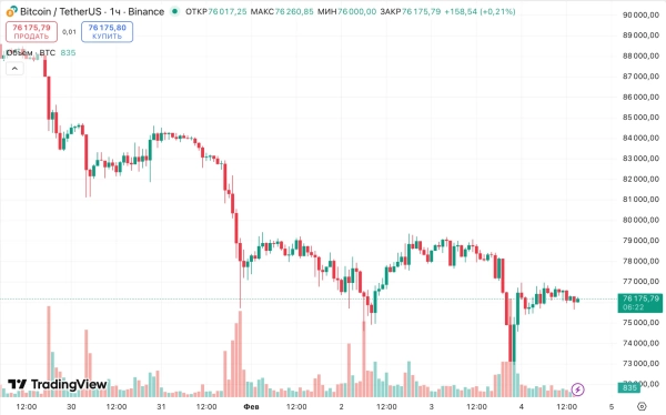 На момент написания биткоин торгуется около $76 100, немного восстановившись после просадки до $73 000 .