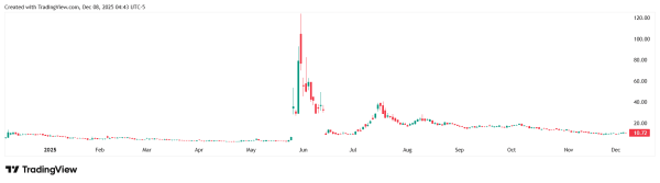 На пике стоимость ценных бумаг компании достигла $124,17 в моменте, но быстро откатилась. На момент написания позиция закрылась на отметке в $10,72. То есть от локального максимума акции упали на 91,35%, хотя Bloomberg приводит значение в 86%.