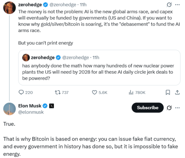 Комментарий миллиардера стал ответом на пост популярного аналитика Zerohedge, где тот объяснял текущий рост популярности биткоина и драгоценных металлов «унижением» ради финансирования гонки вооружений в области ИИ, которая развернётся между крупнейшими экономиками мира при поддержке государства.