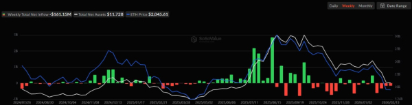 За этот же период спотовые Ethereum-ETF зафиксировали отток на сумму $161,15 млн. В этом секторе ситуация похожа. После притоков 9-10 февраля ($57,05 млн и $13,82 млн) тренд развернулся: 11-12 февраля фонды потеряли $129,18 млн и $113,10 млн. 13 февраля зафиксирован приток в размере $10,26 млн, однако неделя завершилась оттоком.