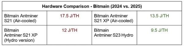 В мае Bitmain представила флагман новейшей серии биткоин-майнеров Antminer S23 Hydro с заявленной энергоэффективностью 9,5 J/TH. Сравнительная таблица ниже демонстрирует, как ведущий производитель усовершенствовал этот параметр своих установок за последние два года.