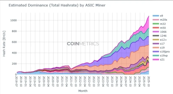 Рост с начала января составил около 25%. Согласно данным Coin Metrics, значительный вклад в него обеспечило массовое развертывание установок линейки Antminer S21 с энергоэффективностью 13–16,5 J/TH в зависимости от модификации. Их доля в совокупном хешрейте к октябрю достигла примерно 20%.