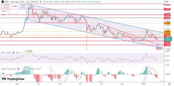 На дневном графике видно, что цена XRP торгуется в нисходящем канале с момента достижения исторического максимума в августе 2025 года, и пока нет сигналов на окончание нисходящего тренда.