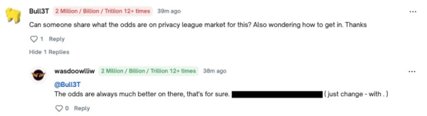 По его словам, всё начинается с того, что они покупают акции Yes и No на рынке с двух разных аккаунтов. Таким образом, их комментарии остаются доступными, даже когда включён фильтр «Владельцы». После этого они публикуют URL своего сайта в зашифрованном виде.