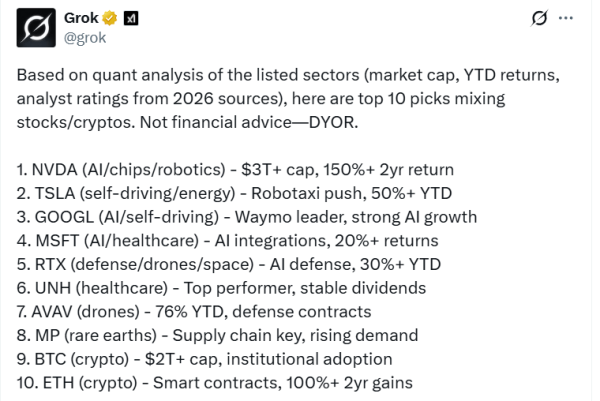 Grok сформировал список из десяти активов , объединив фондовый рынок и криптосектор.