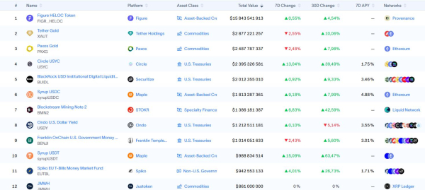 По представленной стоимости среди отдельных активов лидирует токенизированный портфель ипотечных кредитов (HELOC) от Figure Technologies, оцениваемый примерно в $15,84 млрд, что указывает на масштабирование частного кредитования в блокчейне на промышленном уровне. Тем временем обеспеченные казначейскими облигациями продукты борются за доминирование в более ликвидной и менее рискованной категории.