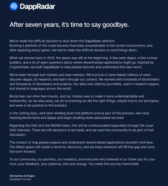 Основатели DappRadar Скирмантас Янушкас и Драгос Дуница сообщили в соцсети, что будут сворачивать работу своей платформы. Они заявили, что «в нынешних условиях ведение площадки такого масштаба стало финансово невыгодным», поэтому они планируют прекратить отслеживание блокчейнов и децентрализованных приложений в ближайшие дни, когда начнётся процесс закрытия.
