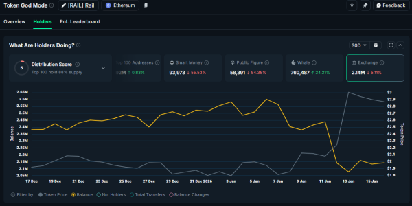 Токен управления RAIL имеет рыночную капитализацию на уровне $165 млн. Аналитики платформы Nansen зафиксировали важные изменения в распределении актива за последние 30 дней. Биржевые балансы RAIL сократились более чем на 5%, в то время как запасы на кошельках крупных держателей выросли на 24%.