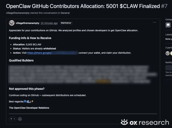 По ее информации, мошенники создавали фейковые аккаунты на GitHub, открывали обсуждения в подконтрольных репозиториях и отмечали десятки других пользователей. В сообщении говорилось, что их выбрали для получения $5000 в токенах CLAW.
