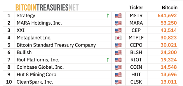 Топ-10 корпоративных держателей биткоина. Источник: Bitcoin Treasuries