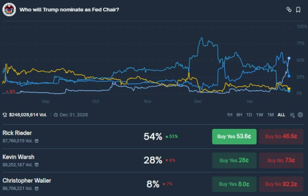 - Руководитель BlackRock Рик Ридер вышел в лидеры рейтинга Polymarket с 54% вероятности возглавить Федеральную резервную систему США.