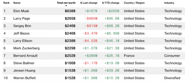 Разрыв между состоянием Маска и вторым самым богатым человеком в мире стал рекордным. Согласно данным Bloomberg Billionaires Index, разница в $237 млрд между Маском и Джеффом Безосом (Jeff Bezos) является самой большой из когда-либо зафиксированных между первым и вторым местами в рейтинге. Ларри Пейдж (Larry Page), соучредитель Google, занимает второе место с состоянием $252,6 млрд.