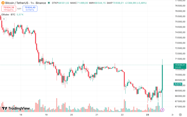 Курс первой криптовалюты подскочил на 3,4% и приблизился к отметке $71 000. Президент США Дональд Трамп объявил о приостановке ударов по Ирану на пять дней.