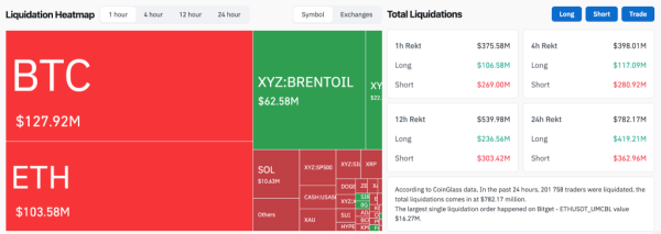 За последний час объем ликвидаций на крипторынке достиг $374 млн, а за сутки превысил $782 млн.