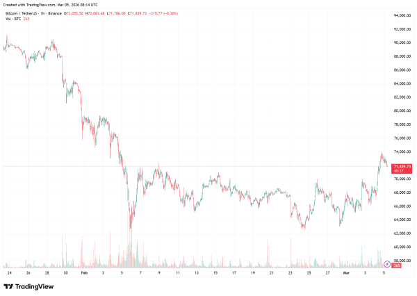 На момент подготовки материала первая криптовалюта торгуется в районе $71 800, по данным TradingView.