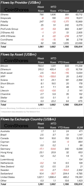 В то время как восстановление биткоина по-прежнему кратковременно, компания Coinshares опубликовала свой отчет о криптовалютах, в котором говорится о притоке средств в размере 1,06 миллиарда долларов на прошлой неделе.